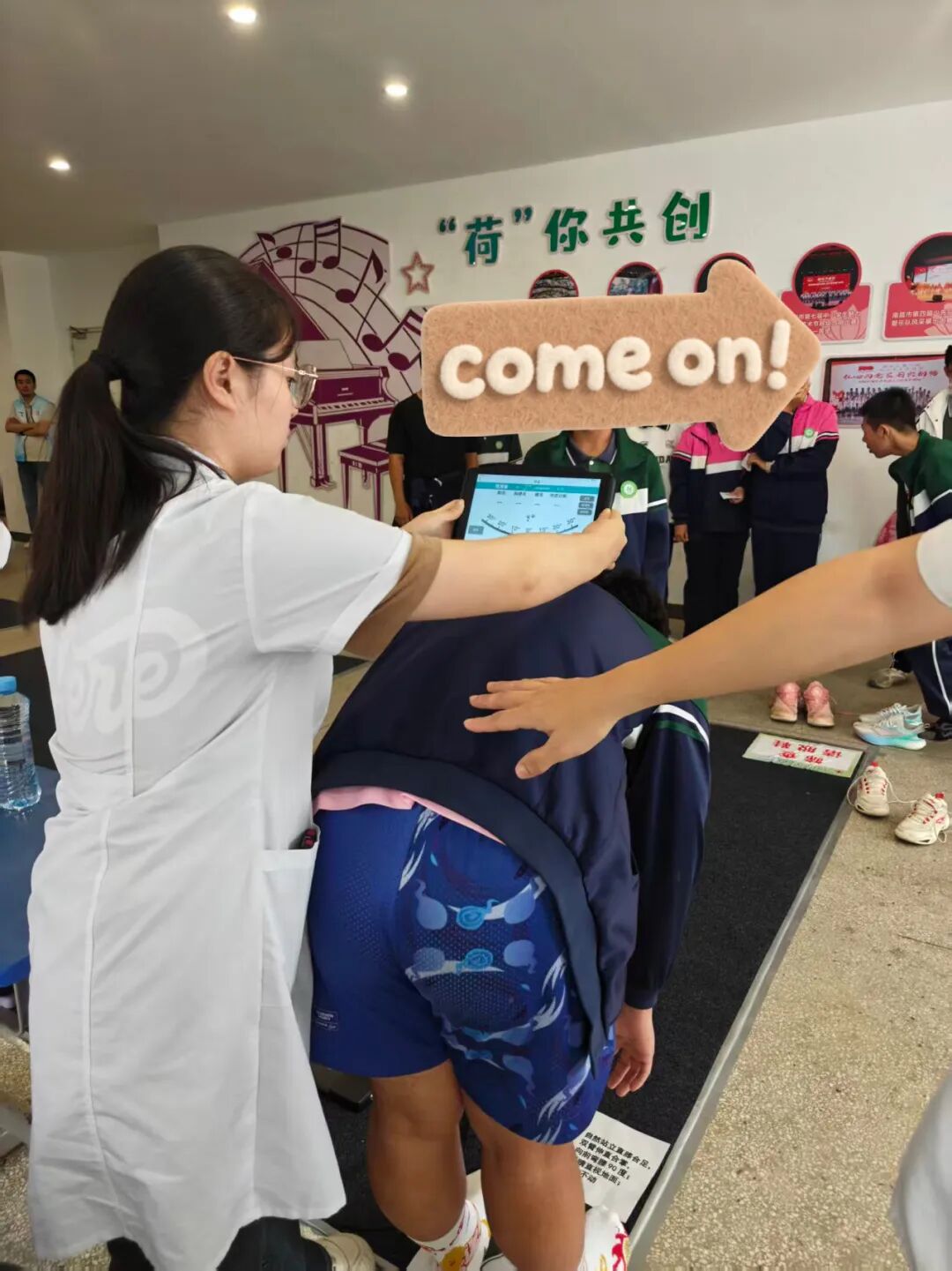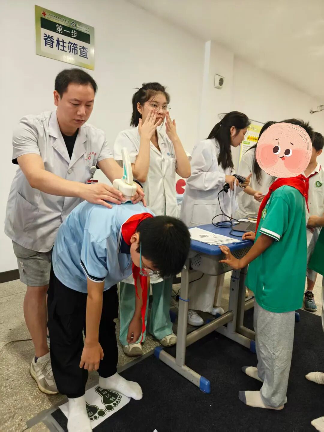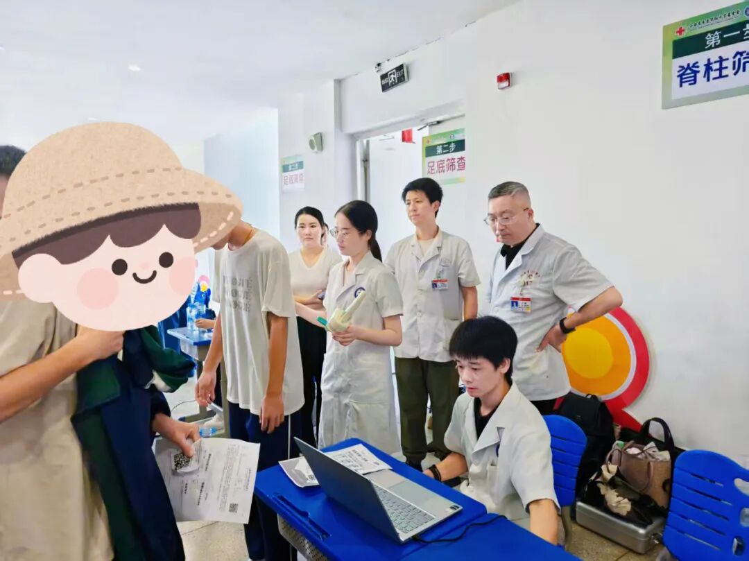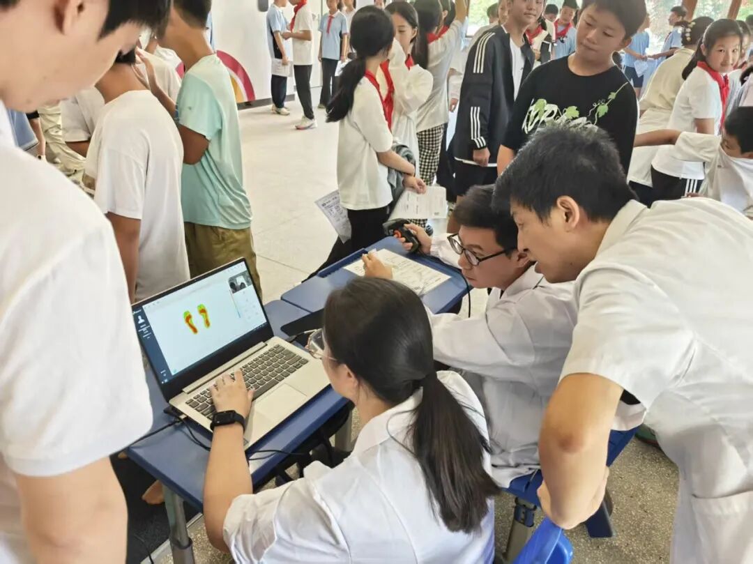 牵头筛查团队阵容强大,包括江西省人民医院康复医学科卢巍主任、徐斯勰副主任、李文生主管治疗师、周锦浩物理治疗师、护理组徐文静以及规培进修老师朱林峰、李佳伟、江水英,还有罗慧、陈美晨、胡佳鑫、刘紫琦等4名实习同学。团队成员分工明确,从脊柱外观检查、弯腰试验到足底压力数据采集,每一个环节都细致严谨,用专业技术为师生健康“把脉”。