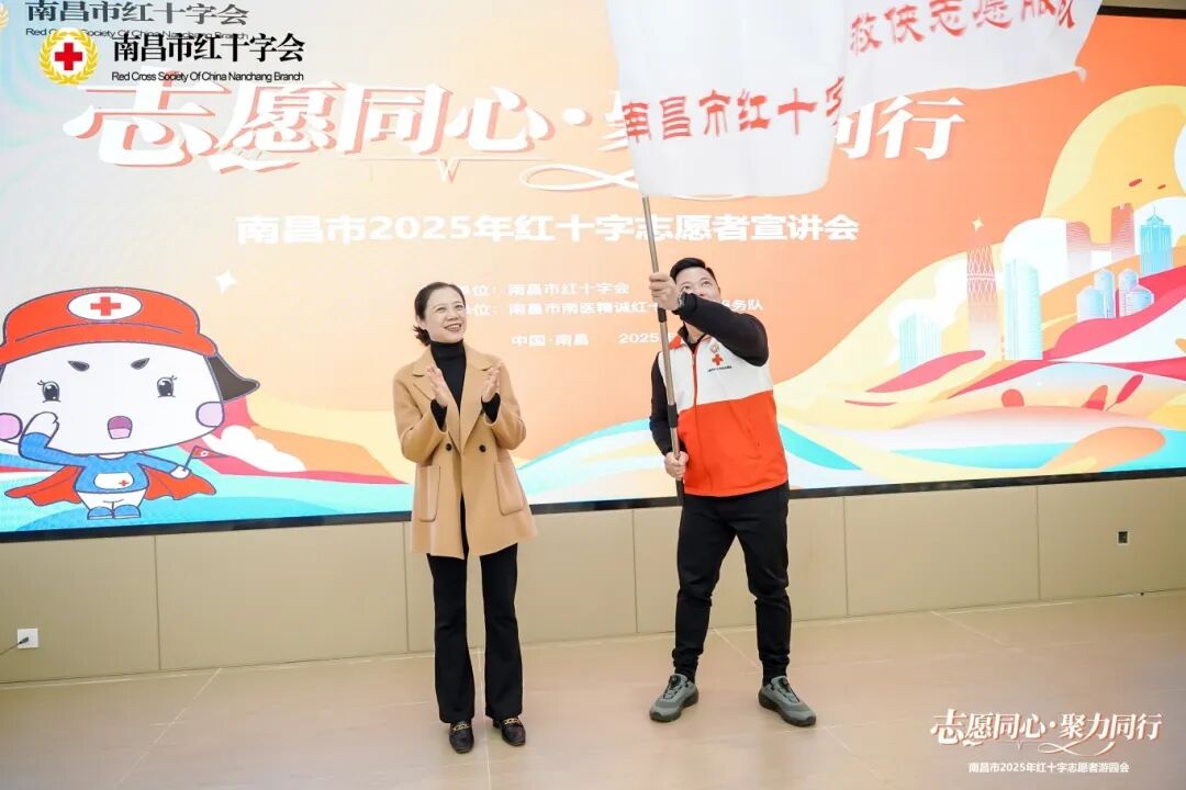 活动第一阶段,南昌医学院临床医学院党委副书记南今娘致辞,向全市红十字志愿者致以节日的问候。市红十字会党组书记、常务副会长潘凌向今年新成立的南昌市红十字洪城急救侠志愿服务队授旗。
