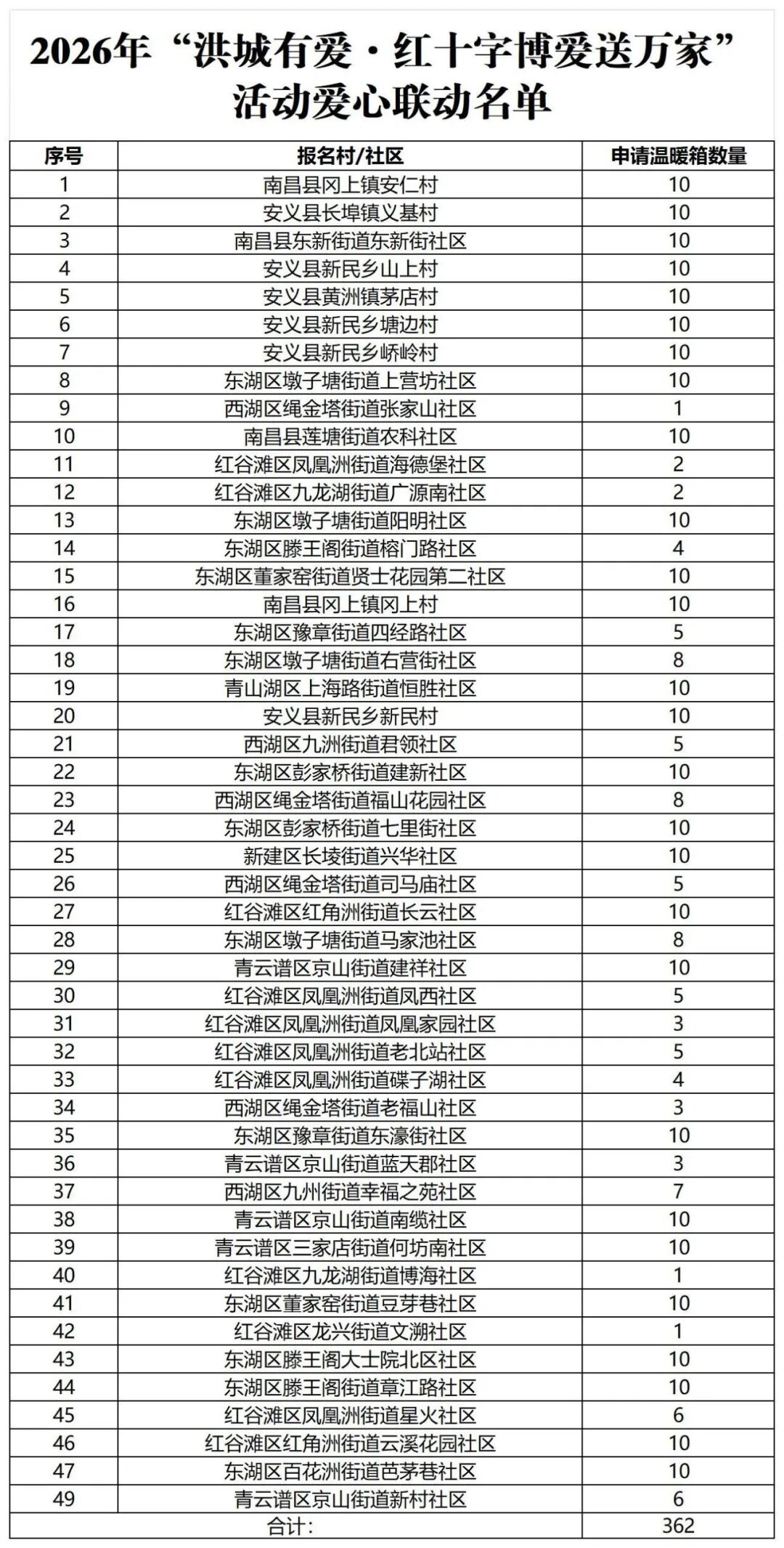 按照报名先后顺序,我会对申报的村/社区逐一进行了核实,确定49个村/社区入选此次爱心联动活动,将携手开展新春走访慰问工作,为362户困难群众送去温暖与祝福。现将爱心联动名单公告如下: