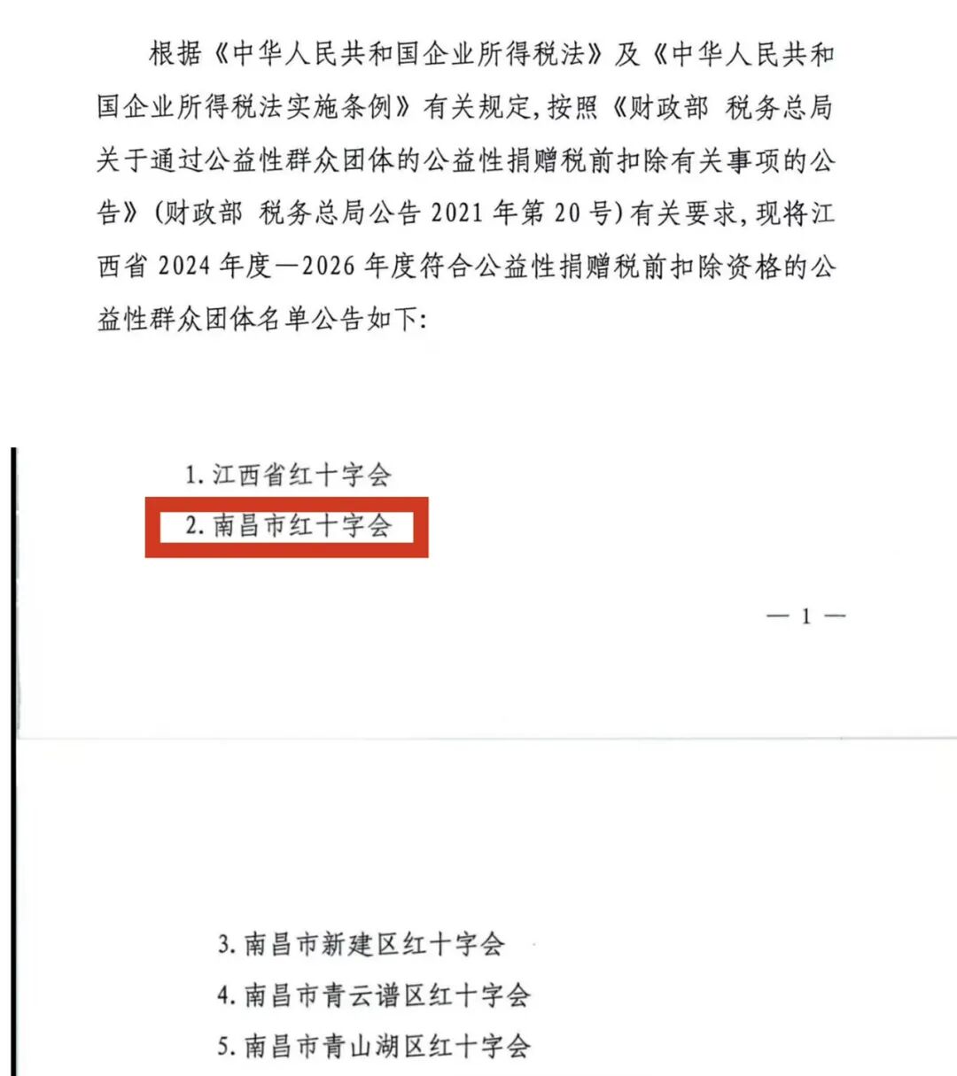 南昌市红十字会、江西省南昌市红十字基金会是具备公益性捐赠税前扣除资格的单位,且扣除资格在有效期内。向南昌市红十字会、江西省南昌市红十字基金会捐赠的自然人可依法享受个人所得税捐赠免税政策。相关文件如下: